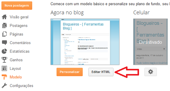 Abra o painel do seu blog no Blogger, clique no menu “Modelo” e em seguida no botão “Editar HTML” para abrir o código fonte do seu blog.