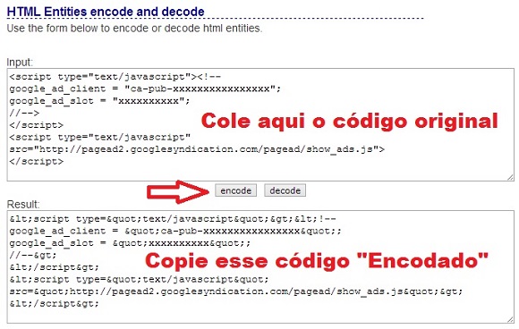 Acesse o HTML Entities encode and decode e, como o exemplo da imagem abaixo, cole o código do bloco de anúncios onde diz “Input” e clique no botão “Encode” para usar o código que aparecer no “Result”: